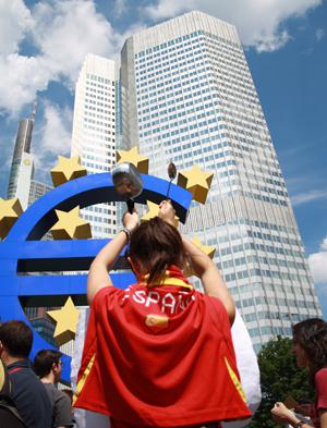 O movimento "Democracia Real Agora!" Atingiu o coração financeiro da Europa, em Frankfurt . O monumento ao euro, o símbolo da economia europeia, debruçou-se ontem de protesto neste sábado em seu rosto, o par animada dos mais de 200 cidadãos mobilizou seus exigindo mudanças sombra.